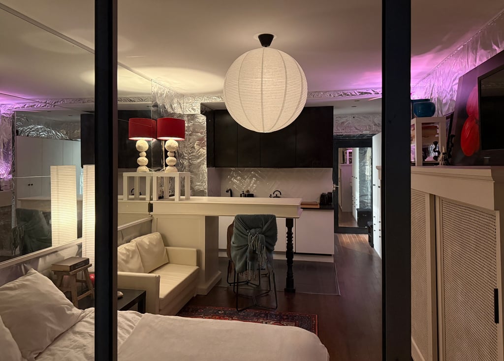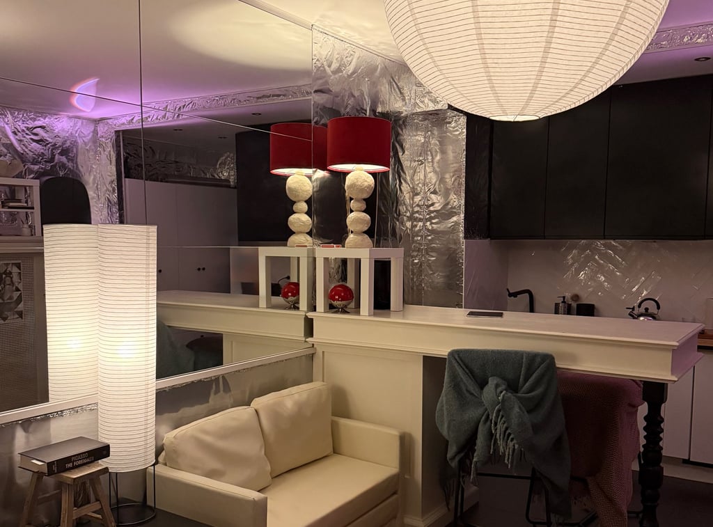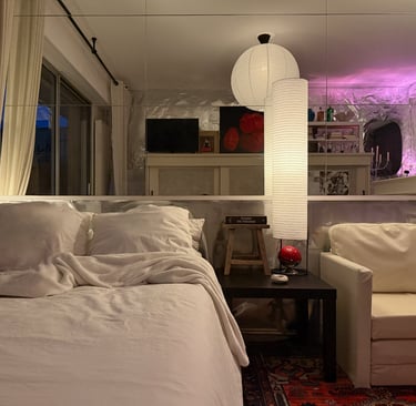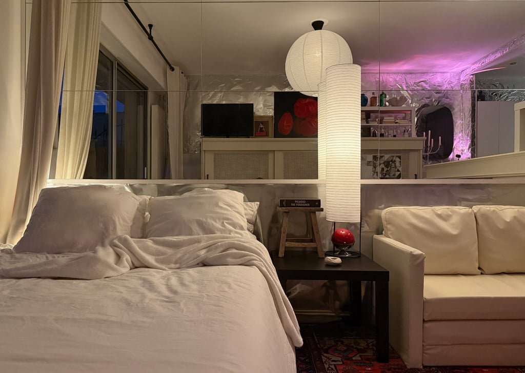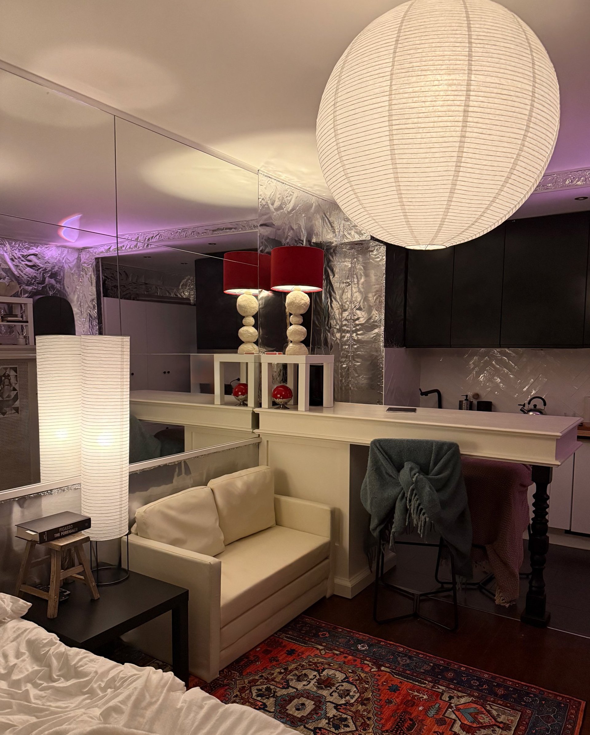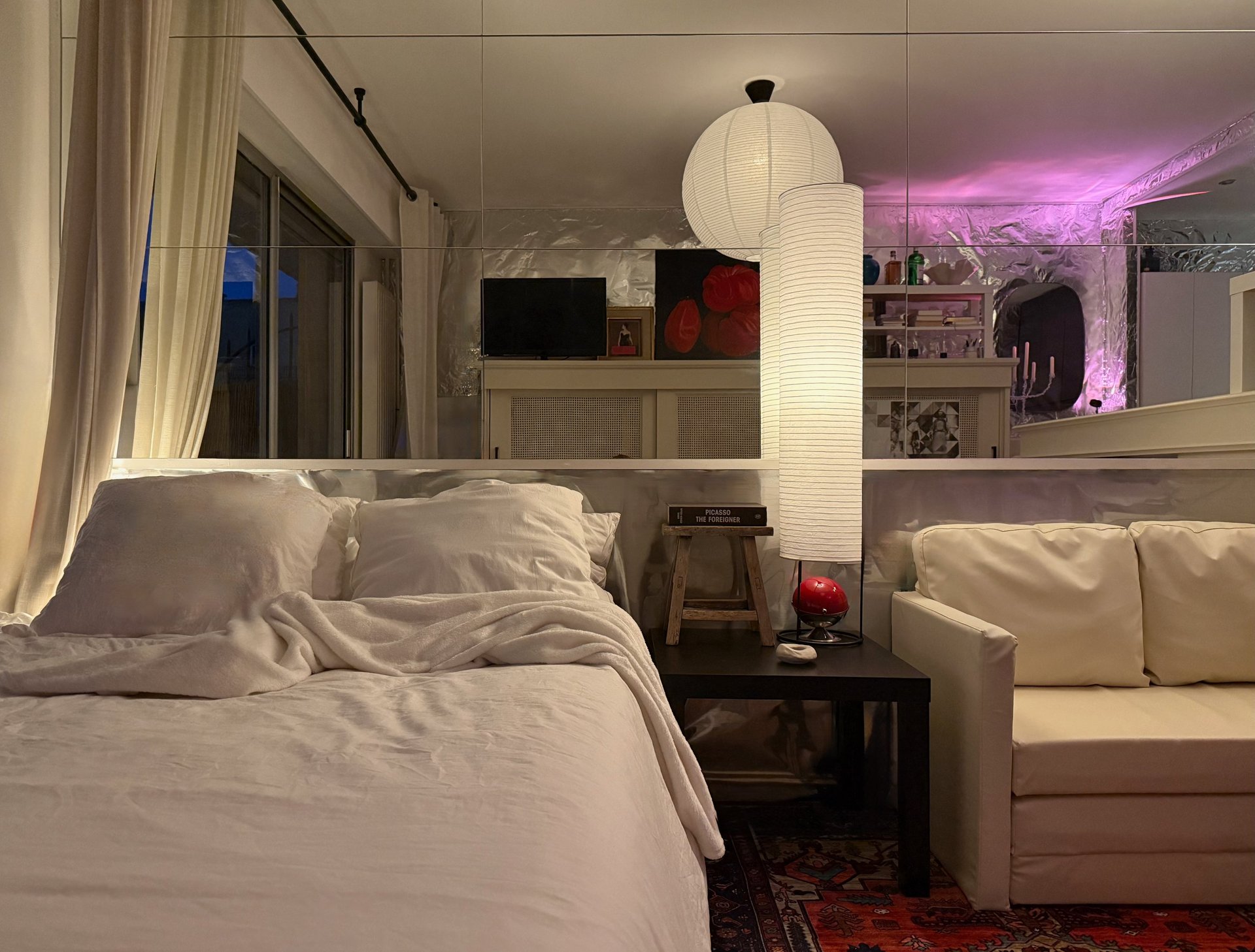 L A Y E R E D P O R T A B L E L A M P S , R E F L E C T I V E T E X T U R E S , A N D C O N T R O L L E D S H A D O W S B U I L D D E P T H A N D A T M O S P H E R E I N A S T U D I O T H A T F E E L S L A R G E R T H A N I T S F O O T P R I N T , T U R N I N G L I M I T A T I O N S I N T O D E L I B E R A T E S P A T I A L D R A M A . R U G S , T H R O W S , C U R A T E D D E C O R P I E C E S , A N D W A L L T E X T U R E S A D D W A R M T H , B R I N G P E R S O N A L I T Y , A N D D E F I N E Z O N E S F O R L I V I N G , W O R K I N G , A N D S L E E P I N G .