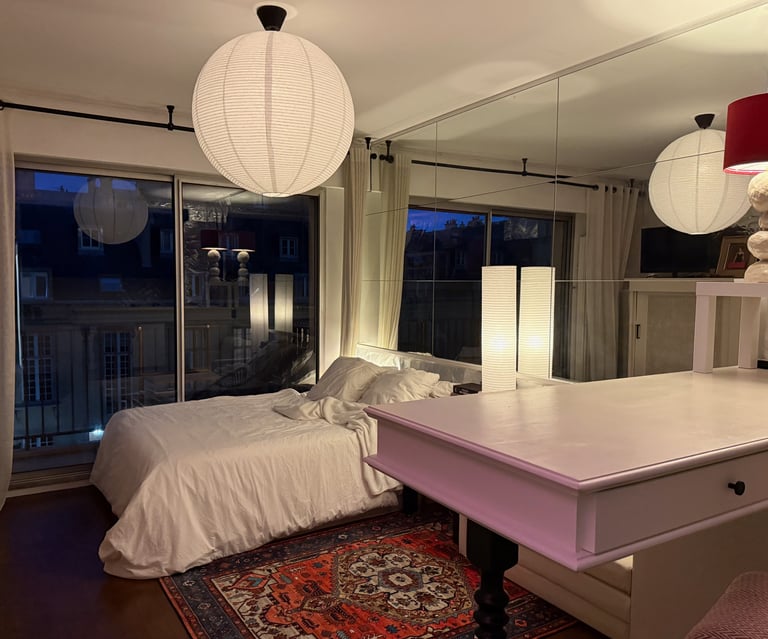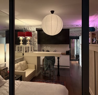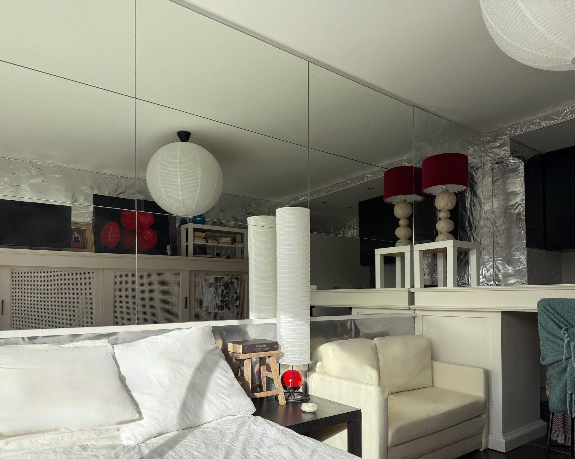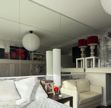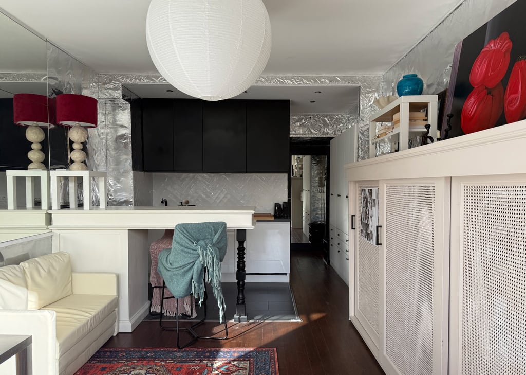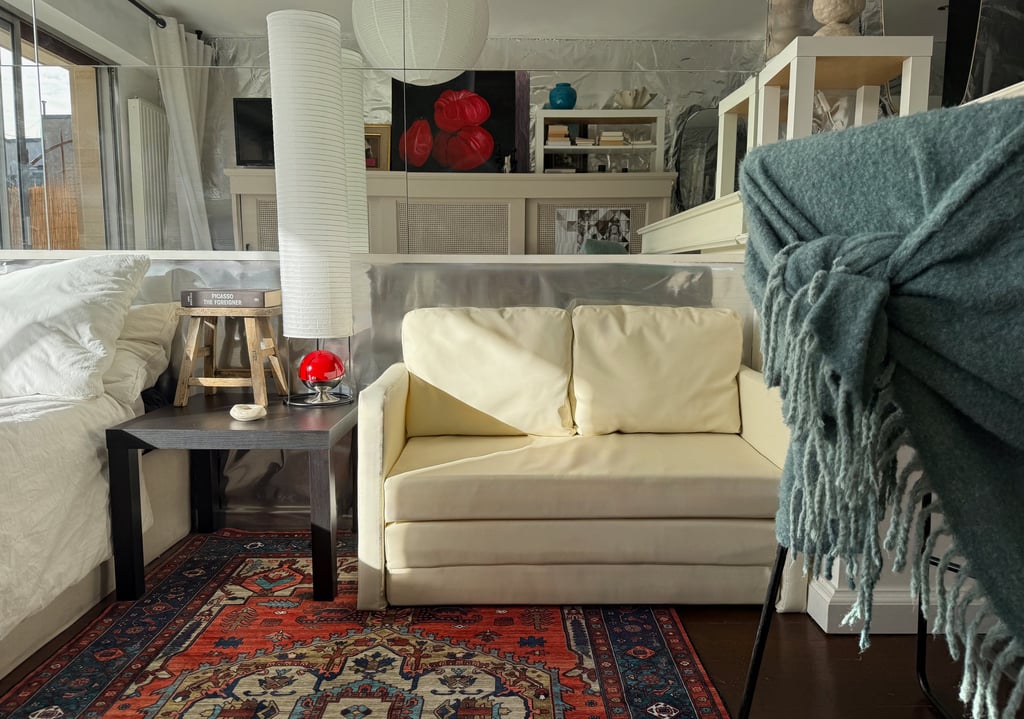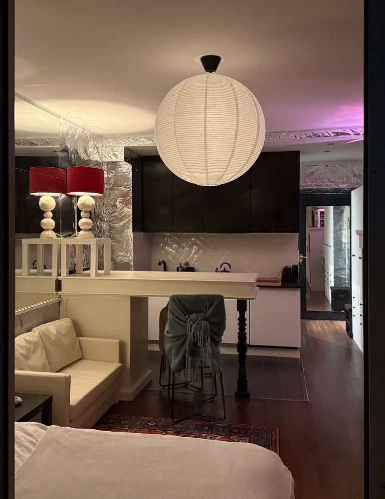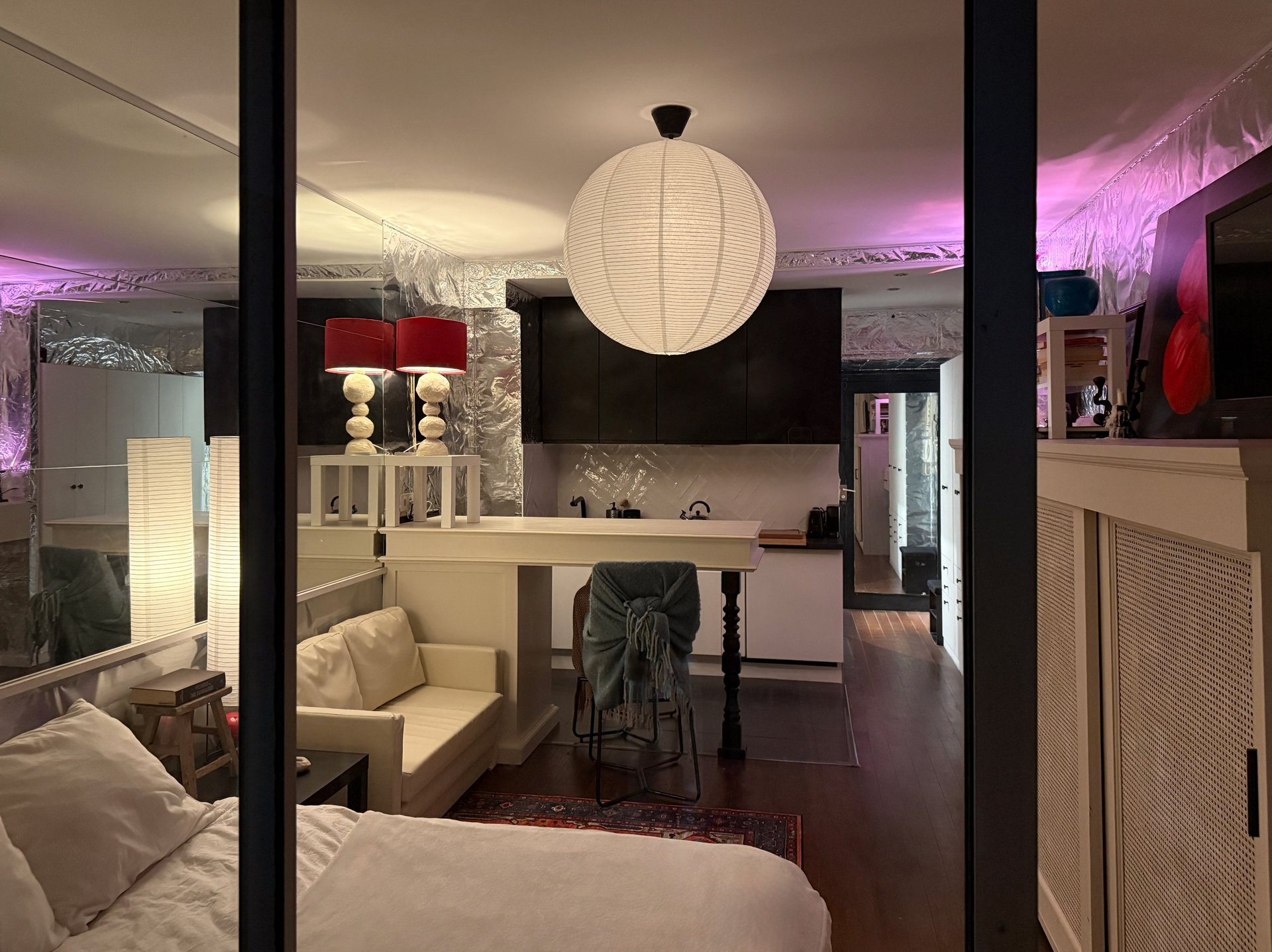 L A Y E R E D P O R T A B L E L A M P S , R E F L E C T I V E T E X T U R E S , A N D C O N T R O L L E D S H A D O W S B U I L D D E P T H A N D A T M O S P H E R E I N A S T U D I O T H A T F E E L S L A R G E R T H A N I T S F O O T P R I N T , T U R N I N G L I M I T A T I O N S I N T O D E L I B E R A T E S P A T I A L D R A M A . R U G S , T H R O W S , C U R A T E D D E C O R P I E C E S , A N D W A L L T E X T U R E S A D D W A R M T H , B R I N G P E R S O N A L I T Y , A N D D E F I N E Z O N E S F O R L I V I N G , W O R K I N G , A N D S L E E P I N G .
